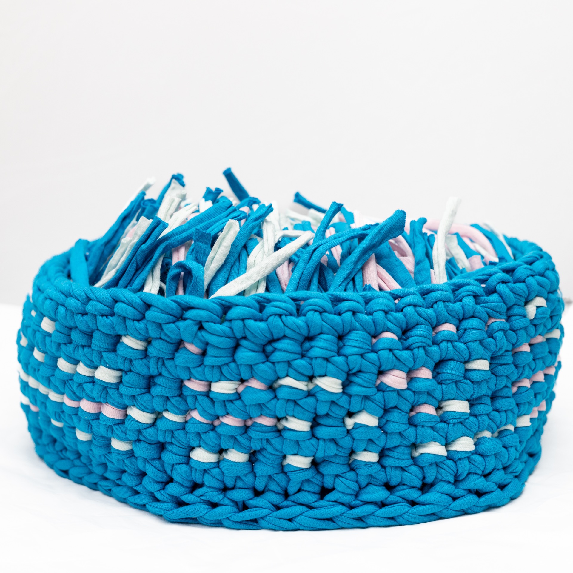 Nuuskukorin halkaisija noin 30 cm ja reunan korkeus noin 10 cm +-2 cm mittavara. Tässä nuuskukorissa on turkoosin ja vaaleanpunaisen lisäksi vaaleanvihreään taittavia hapsuja.